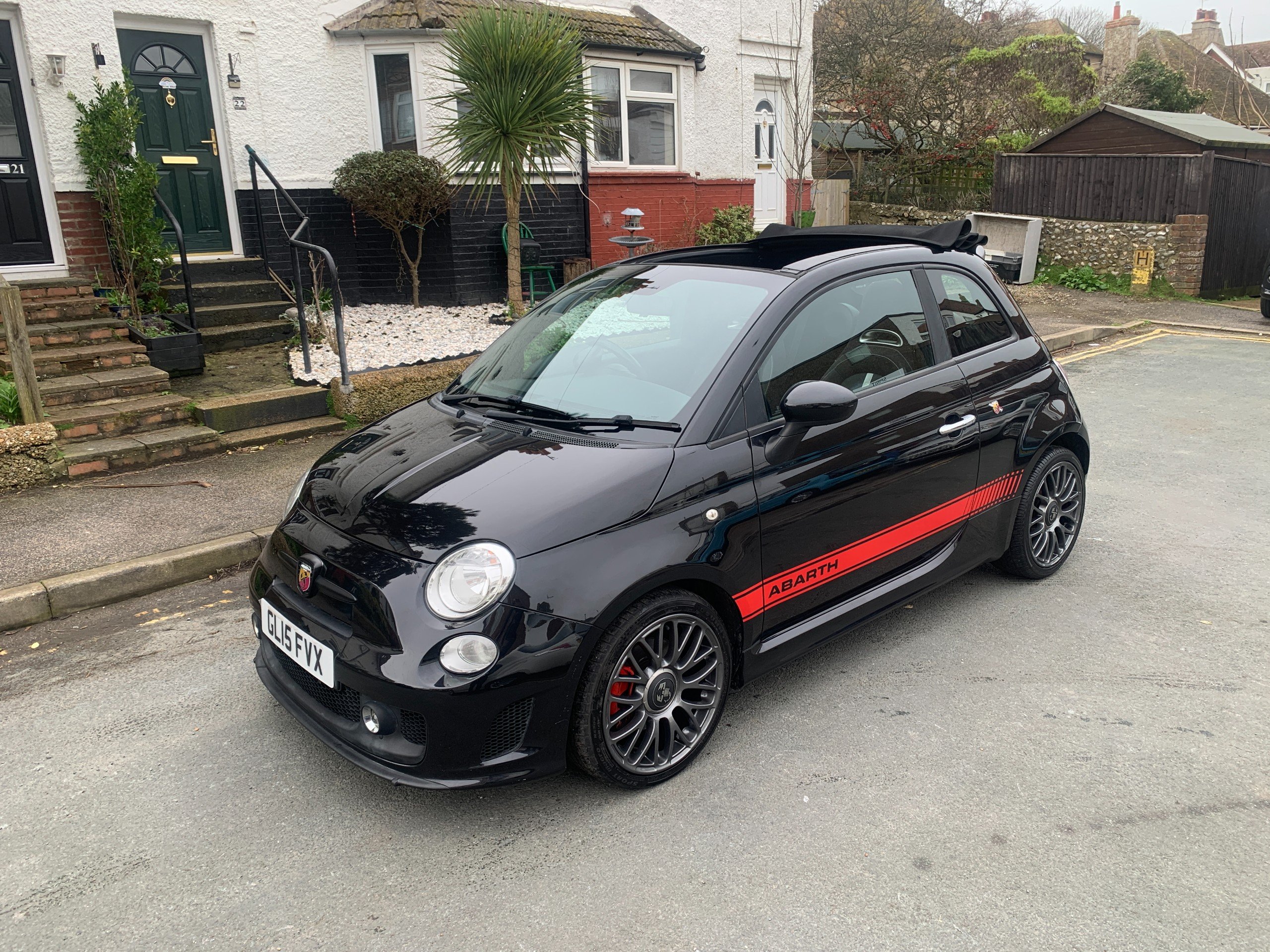Good condition for this fantastic looking Abarth 595 Cabrio, with black roof and contrasting red stripes and red brake calipers, finished off with newly refurbished grey alloy wheels. This car is the 1.4 t-jet 145 bhp, and totally standard, with a great spec, including: